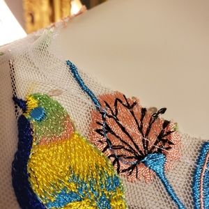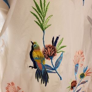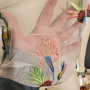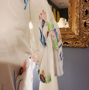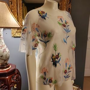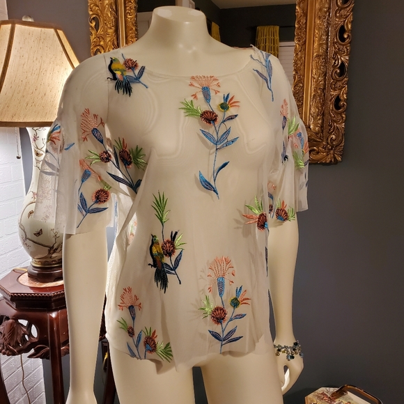 I do not recall brand, purchased at Stein Mart. Sheer white blouse with detailed embroidery of flowers and birds. Looked great with coordinating tank. Ruffled sleeves. Size L