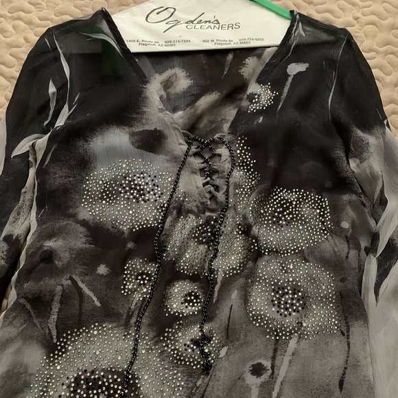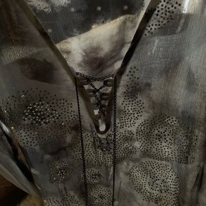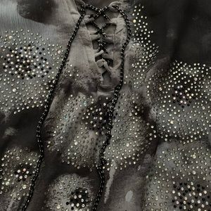 Sheer top with rhinestones and chain tie. See through, size L but I took tag off since it was see through. Fun, great with leggings. Been worn! Smoke free home!