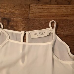Sheer off white top with keyhole back and ruffle at bottom. Has flare sleeves and cold shoulder. Super cute and never worn.