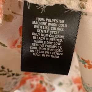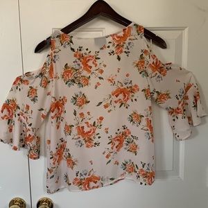 Cute top with opening at shoulders and ruffled at the ends of sleeves. Sleeves are 3/4 long. Sheer material I normally wear another top inside since the material is see through. Wore a couple of times still in good condition.