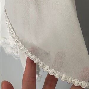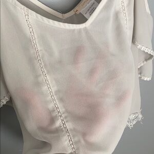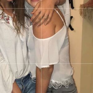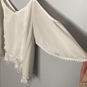 Cute sheer white with lace detail cropped cold shoulder spaghetti top. Beautiful lace detailing at the bottom of the shirt, and tassel on the arm pieces. Adjustable straps, and sheer top. Needs a nude top or bralette! :) size XS. and fits true to size. Two minor marks as pictured. One on the arm which is barely noticeable and the other on the back. Could possibly come out in the wash!