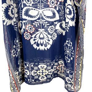 Sheer Tunic Coverup with Side Slits Pullover Blue and White Floral Print