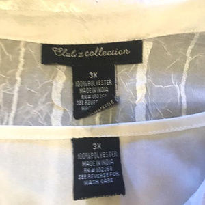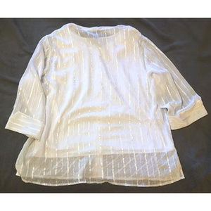 EUC. Sheer white blouse with 3/4 cuffed sleeves and collar. Diagonal stripes in satin. Includes white cami that is attached and is shorter than the outer shell.
