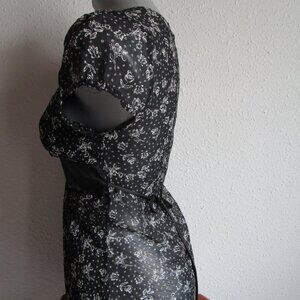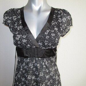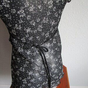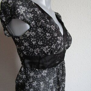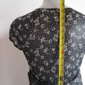 Sheer black short sleeve blouse, size M. Tunic hangs 23 inches from shoulder with a slight flare ruffle hem.