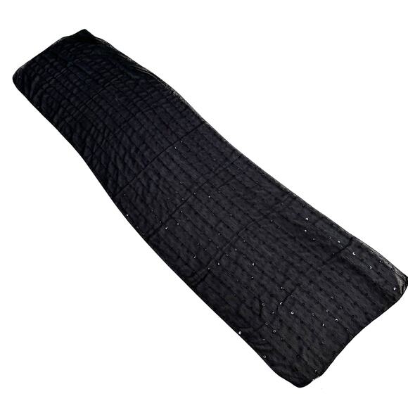 Sheer black silky chiffon scarf - 100% polyester with a lovely drape and feel - slim lines of sequins stripes run the length of this piece. This scarf is dressy and very sexy with whimsy goth vibes. The perfect New Year's Eve accessory that will find plenty of uses throughout the year! In excellent condition - no apparent damage or flaws - tres chic!