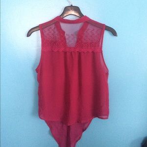 I would suggest wearing an undershirt with this top. It is very sheer with cute details at the top. It also ties at the bottom/front. It says it's a large, but it fits me very well and I am usually a small/medium. Willing to hear all offers :)