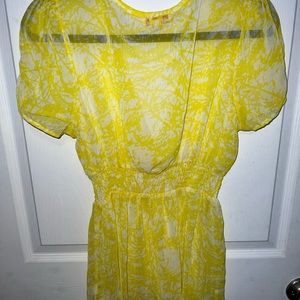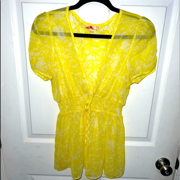 This is an adorable yellow and white marbling sheer babydoll blouse with a smocked waist and faux tie. Wear it with a cami underneath. Pair it with jeans. Perfect for Spring/Sunmer.