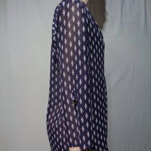 You are looking at a Maurices sheer long sleeve blouse in size medium. It is a dark blue color with a white pattern throughout. This garment is 100% polyester. It comes from a smoke free, pet-friendly home.