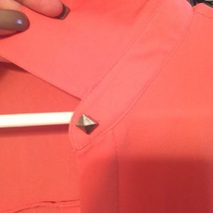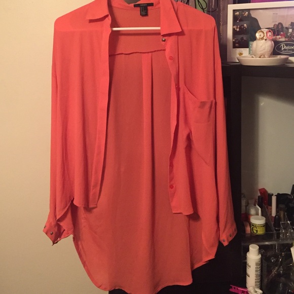 Sheer button down. Very formal. Has gold square detailing under collar and around cuff area.