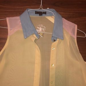 Light blue denim collar, light pink shoulders and yellow blouse. Never worn
