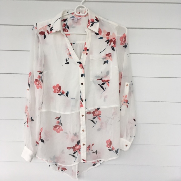 A button down from Candies. It features metallic buttons and is a low to high fit. The fabric is sheer with a beautiful floral print. It is in like new condition.
