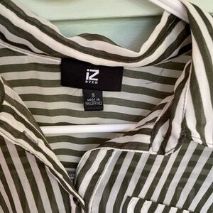 Women’s green and white striped sheer/transparent button down, with black tank.