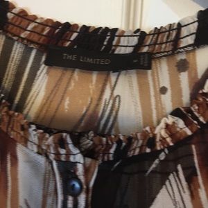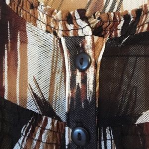 Sheer button down blouse. Dark brown, tan and cream colors. Easy to wear and looks nice alone or paired with a blazer.