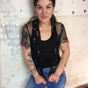 Sheer black button up with embroidered red flowers. This one has been a favorite of mine for a few years now. Hard to part with 😢. I wear it open like a cardigan because I’m a size medium and this garment is a small to extra small.