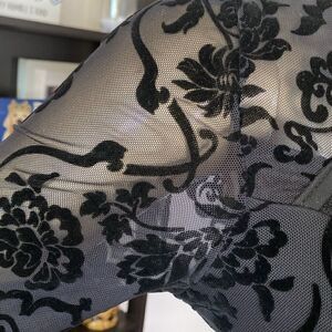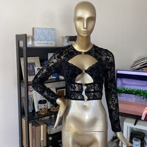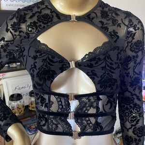 Sheer cropped corseted top padded boobs size medium black on black. Velvety flocked print, silver front clasp closures.