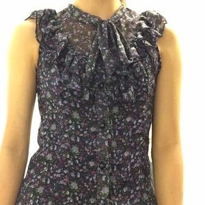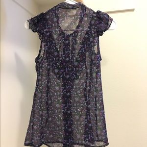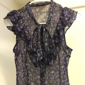 Sheer floral button down top. Ruffles in the front. Can tie a bow in the front.