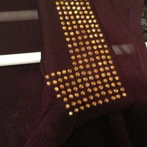 Dark purple button down top. Sheer with longer sides. The collar has little rose gold rhinestones all over. New, never worn, still has tags 😄