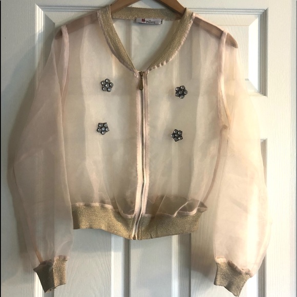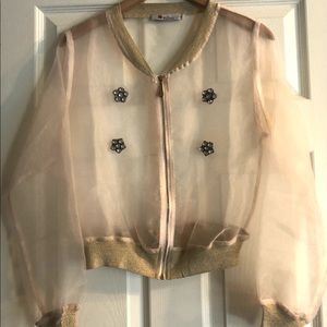Beautiful one of a kind sheer jacket with zipper, and nice understated knit fabric. Looks beautiful worn over a sleeveless dress, tank tops, or with camisole and jeans.