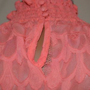 This top is sheer and is a pretty orange/peach shade. There is a small rip in the back that isn't too noticeable and can easily be fixed. Tear is shown in the picture.