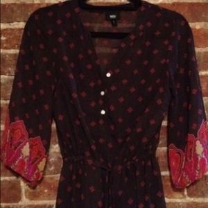 Sheer 3/4 sleeved dress with slip, red paisley against dark brown, great condition. HP 5/16!