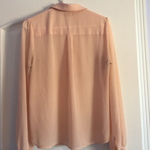Chiffon sheer button-up blouse with rhinestones on collar and end of sleeves. Cream/pastel/peach color