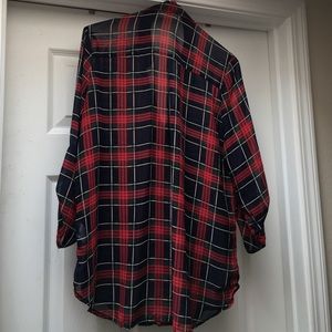 🎉VALENTINES ❤DAY SALE🎉 Sheer traditional plaid colored blouse. Large but fits like a medium. Adorable with a black cami underneath! Open v-neck front. Only thing wrong is a tiny wear spot on bottom, shown in third picture