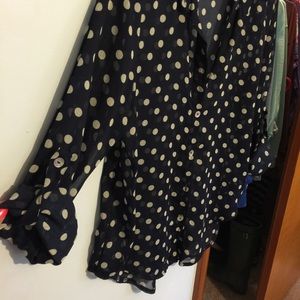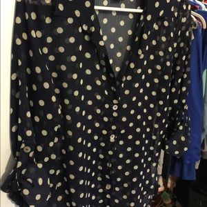 Sheer button down. Navy blue with white polka dots, collared, can roll sleeves (as shown), great condition