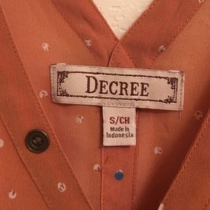 Sheer rust/orange decree hi/lo blouse with white and teal polka dots and button detailing. Buttons are not functional.