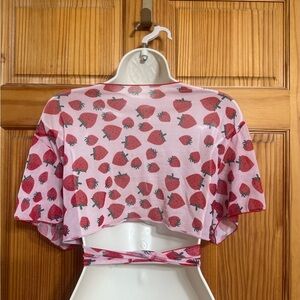 Sweeten up your style with this adorable strawberry-print mesh wrap top! Featuring a sheer pink base covered in juicy red strawberries, this playful crop top ties at the waist for a flattering, adjustable fit. Lightweight and stretchy with flutter sleeves, it’s the perfect layering piece for festivals, date nights, or summer selfies.