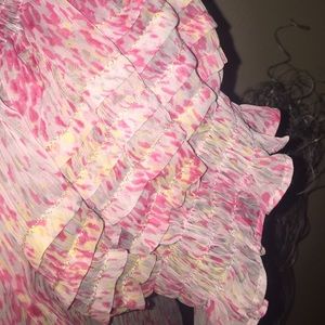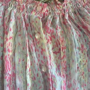 100% polyester sheer top. Pale yellows and pinks, detail buttons and stitching. So cute! Necklace not included