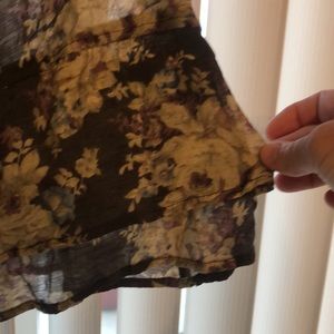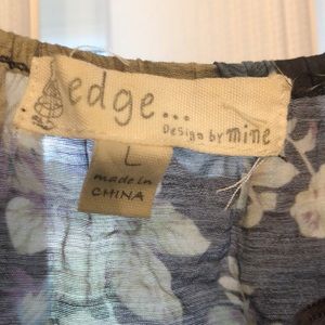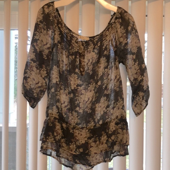 This is a sheer top with 3/4 sleeves. There are 3 decorative buttons on the top. The sleeve bottoms, the neckline and the waist are elastic. The colors are mainly purple and brown with a little blue and green as well. This is super cute and only worn a few times!