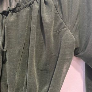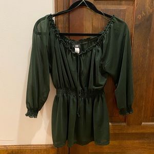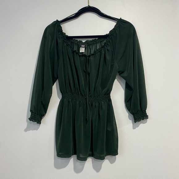 Empire/mid waist elastic top. With elastic 3/4 sleeve and ruffle edges. Top is sheer and ruffled boat neck shape. Cute peplum like chiffon top. Very flattering when worn. There are a few slight pulls in the fabric as pictures
