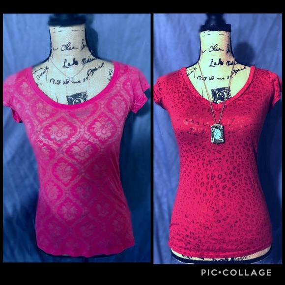 Red and bright pink sheer tops! Pink is size L and red is size M. They run pretty much the same in fit.