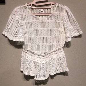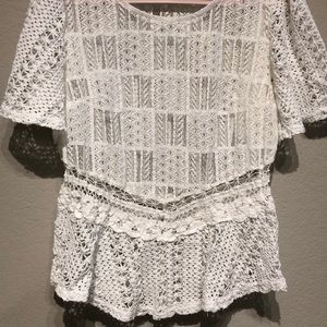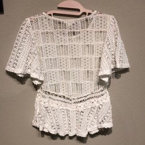 Beautiful sheer white top with crocheted detailing. Could be considered a crop top on someone with a long torso. Wear with tank top or a bralett for a sexier edge. Great condition! Worn once.