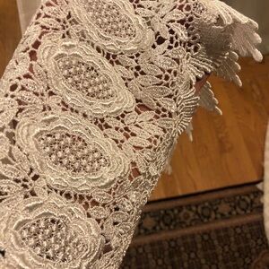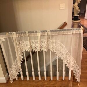 Never used beautiful sheers Curtains with Amazing design. The laces are gorgeous it’s for 3 big windows and one small window the shapes are like triangle cut. The small one is 35X39 inches and the big one each piece are 46x62 inches I paid a lot for it the color is cream the laces are off white color each window have two pieces