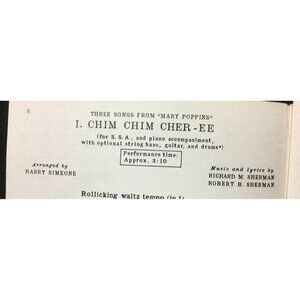"I. Chim Chim Cher-ee" From Mary Poppins by Richard M. Sherman, Robert B. Sherman, arranged by Harry Simeone for treble voices. ©Walt Disney Productions Shawnee Press Inc. ©1963 Wonderland Music Co ©1965 Wonderland Music Co Made in the U.S.A. Measures: 10½"x 7", 1oz.