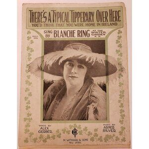This Sheet Music "There's a Typical Tipperary Over Here- You'd Think You Were Home In Ireland' features a photo of Blanch Ring, the singer who popularized the song. Words by Alex Gerber and music by Abner Silver. Copyright MCMXX (1920) by M. Witmark & Sons. International Copyright Secured. 7468 Slightly Frayed Edges/ Water Stain On Interior- See Photos Please