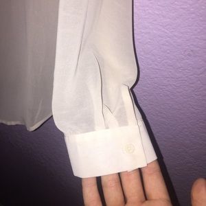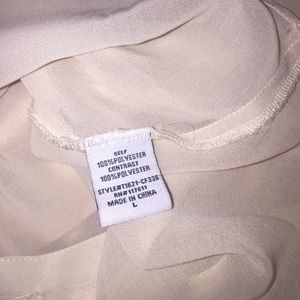 Purchased in a small California boutique, this blouse is fun and sassy! Sheer cream blouse with three quarter sleeves and gold embellishment on front center of blouse. Dry clean only. Worn only once!
