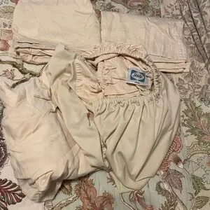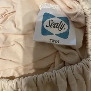 One brown full flat sheet, one Sealy fitted twin cream sheet, two Sealy cream pillowcases.