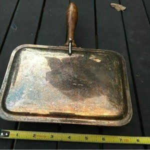 The Sheffield Silent Butler 68 is a vintage electroplate silver portable tray with a hinged lid and wooden handle to use as ashtray or for crumbs. it has an etched dragon on top of the lid. This piece has tarnish on the outer section and should clean up nicely and the inside is clean. This unique item would look great in any rustic décor setting. See pictures for size and condition.