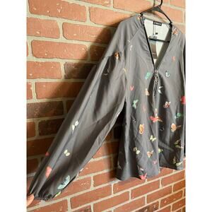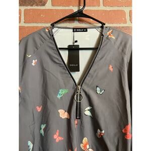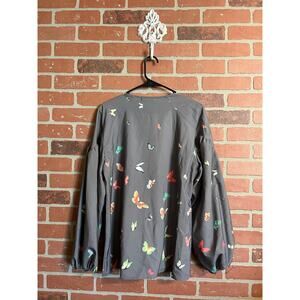 Gray long sleeve butterfly top size M. Top features long sleeves with elastic at the ends, exposed zipper along the neckline and chest for closure. Top is lightweight and fabric feels fresh. Beautiful butterfly print top that can be styled in many ways.
