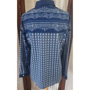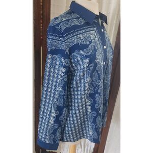 ▪︎DESCRIPTION: Western styled dressy button up blouse. Blue and white handkerchief pattern. Long sleeved