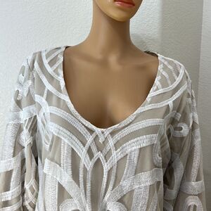 Sheilay Dress Size 3XL Sheer White Embroidered Beige Lining V Neck Long Sleeve