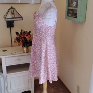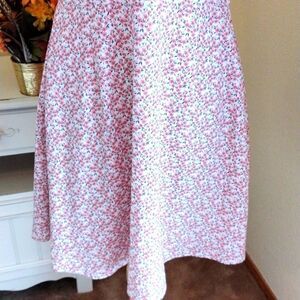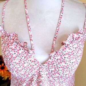 Super cute sundress. Strappy top with built in bra. Ruffles above bra. Elastic at back and adjustable straps. Back zip. A waist seam and full skirt are finish off this cutie. Retro floral design. Size XL measures 40 at chest, 32 at waist, full skirt, 52 at hips. 37 long from shoulder to hem. Darling with sandals or cowboy boots or barefoot!