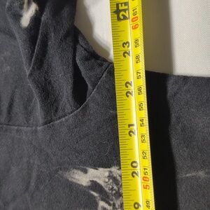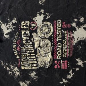 Black t-shirt featuring a bold motorcycle graphic. Unique distressed look adds character.