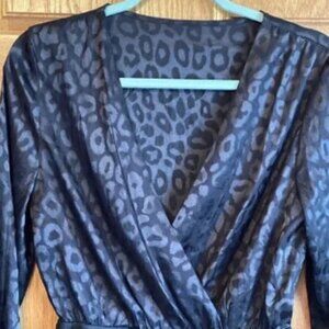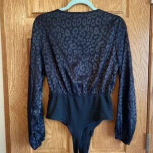 Shein Black Satin Bodysuit Size Medium Embossed Leopard Print Snap Closure