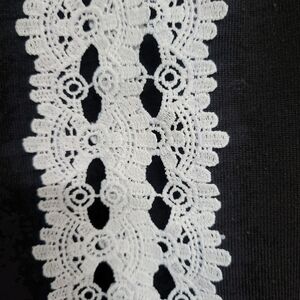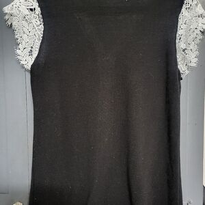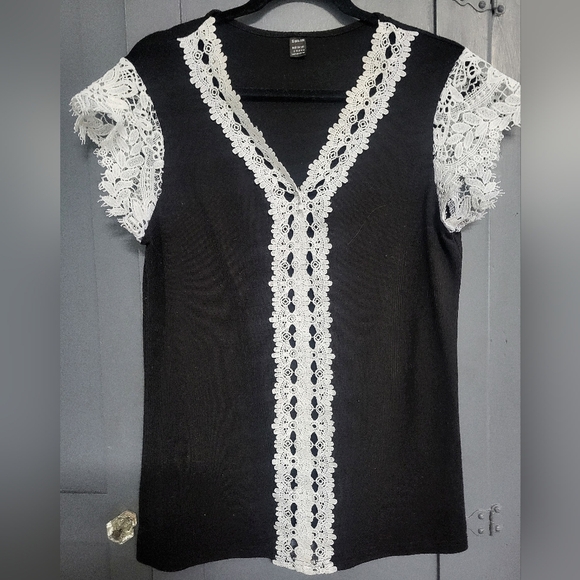 Elegant black top with white lace trim, perfect for any occasion. The delicate lace adds a touch of sophistication.