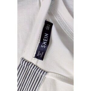 Trendy blouse by Shein, designed with a wide flare cut and 8" gathered ruffle on the bottom. Self-tie in back for extra accent. Good condition, but there is small, hard to see, shaded stain on the front. Note in attached picture.