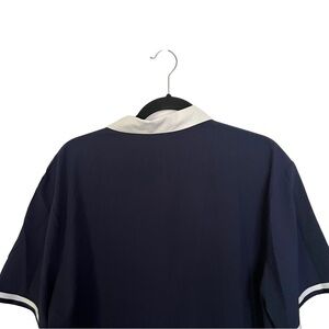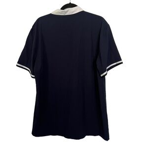 Blue / white trim, short sleeve, bowling style button down shirt. Preowned but in good condition.