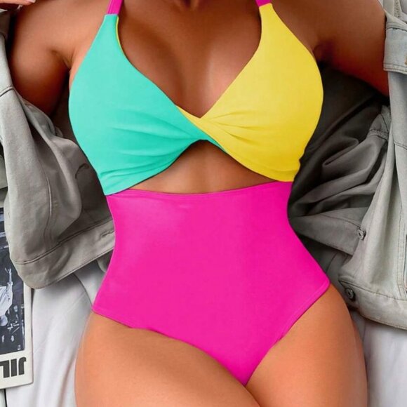 Shein Brand Size small Color Block Twisted Front Cut Out Swimsuit Monokini Neon